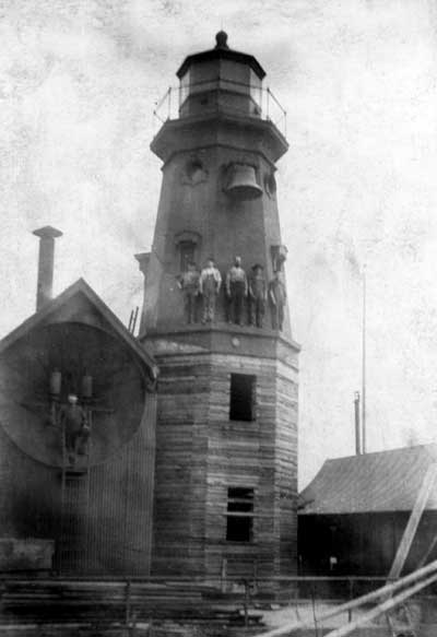 In 1903 the Cleveland West Breakwater Lighthouse was raised 20 feet on a timber structure. The top of the structure was brought to the site from Rochester, NY. In one foggy season, an amazing 42 tons of coal were used to operate the fog signal. We wonder what OSHA officials would say today about the five workmen showing off for a photo while standing on the narrow ledge high above the ground? Back to the edition of: May 2009