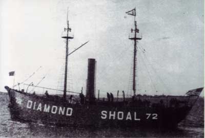 If you look closely on this vintage photograph, you will see the official flag (pennant) of the United States Lighthouse Service flying from one of the masts of the Diamond Shoals Lightship LV #72. In 1939, the United States Lighthouse Service was merged into the United States Coast Guard and the flag was discontinued. (Lighthouse Digest archives photo.) Back to the edition of: September 2009