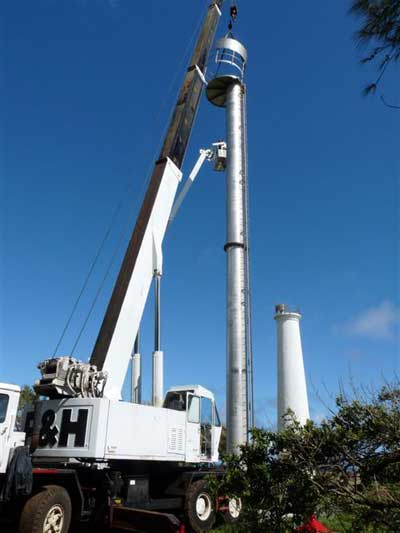 The open-air lantern room is hoisted into place atop the new Kauhola Point Lighthouse. (Photograph courtesy BMCS Dave Garrett, USCG.) Back to the edition of: December 2009