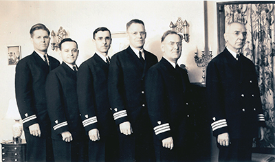 In 1939, Frederick P. Dillon was ordered to report to the United States Coast Guard District Office for the Great Lakes located in Cleveland to be a temporary Chief of Staff assigned to help organize the consolidation efforts with the Lighthouse Service. While there, he met a number of former colleagues from the Detroit and Buffalo offices who had likewise accepted the new Coast Guard commissions. Frederick Dillon said that when all were attired in their new uniforms and “elegantly equipped, the lighthouse gang had a group picture taken for posterity.” Frederick Dillon is pictured second from the right. (Photo courtesy of Frederick P. Dillion III)