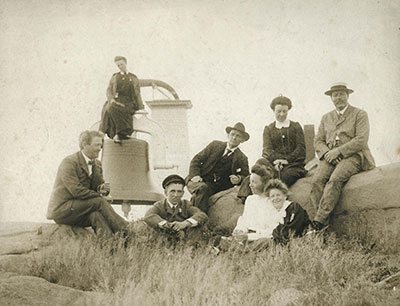 This photo of keepers and others posing with the fog bell was taken during a Sunday afternoon picnic at the Manana Island Fog Signal Station. Seated to the far right are Susie Pierce and her husband, Frank Pierce, the keeper of Manana Fog Signal Station. Willie W. Corbett, the assistant keeper of the Monhegan Island Lighthouse, is seated on the ground in the center. The women seated on the ground to the right of Willie Corbett are Olga Stevens, the daughter of Monhegan Island Lighthouse head keeper Dan Stevens; and Flossie Pierce, daughter of Manana Island Fog Signal Station keeper Frank Pierce. The names of the other two men in suits and the name of the woman sitting on top of the fog bell are not known. If you look closely behind the fog bell, you will see the top of the fog signal tower with the fog horn protruding from the top of the structure. (Photo courtesy of the Monhegan Museum.)