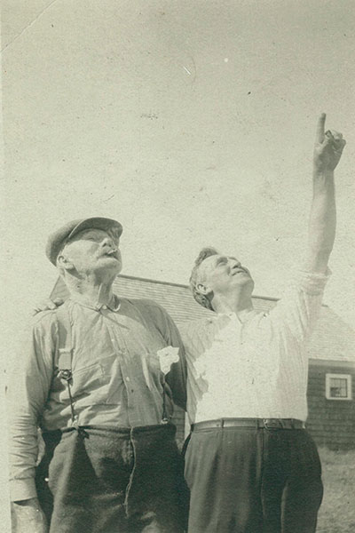 Ambrose Wasgatt (l) is shown here in his retirement years with an unidentified man looking up the sky, perhaps at a newfangled airplane flying over.