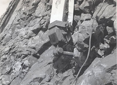 According to Assistant Superintendent Merrill’s written report, “All that remained of the derrick was the bottom end of the two stiff legs which were anchored into the solid rock. One of the anchorages, 3” in diameter eyebolts, and 3 feet long pulled loose, crumbling the rock around the anchor bolt.” (Courtesy Coast Guard Historian.) Back to the edition of: Jul/Aug 2017