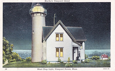 Vintage nighttime post card of 1891 West Chop Lighthouse on Martha’s Vineyard, Massachusetts where Carl Hill was stationed from 1920 to 1922. Today, the keeper’s house is Coast Guard housing. (Lighthouse Digest archives.) Back to the edition of: May/Jun 2018