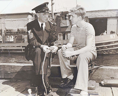 Lighthouse keeper Carl D. Hill is shown here in his Coast Guard uniform toward the final days of his career. He is showing the proper way to tie a knot. When Carl Hill retired from the Coast Guard, he travelled to California to meet his son Mark, who had been discharged from the Navy, so that the two of them could travel back to New England together. (Photo courtesy Cindia Brown.) Back to the edition of: May/Jun 2018