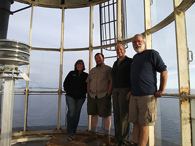 Inside the gigantic lantern of the Rock of Ages Lighthouse are volunteers Kim Croliss, David Gerth, Heather Gerth, and Steven Lein. It’s always a good place to take a break and enjoy the view. In 1985 the massive Fresnel lens was removed from the tower and placed on display at the Windigo Visitor Center in Isle Royale National Park. The lantern now has a modern optic. Back to the edition of: Nov/Dec 2018