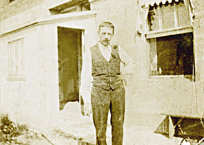 1st Assistant keeper Charles N. Miller stands smoking his pipe outside an entrance to the old hospital building that was used for keeper accommodations on Bedloe’s Island. After Charles eloped with Dorothea “Dora” Tiedgens on September 1, 1892 and brought her out to the Island to live with him, life became settled for him since he finally had his “Heart’s Desire” to keep him company. (Courtesy Lehman College, CUNY. Charles Miller Collection)