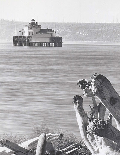 Axel Anderson frequently visited Desdemona Sands Lighthouse to make repairs and install new equipment. This rare photo of the now destroyed lighthouse shows the newly constructed shed sitting on a new pile platform attached to the side of the old one. Axel spent several days there setting up the automatic flashing light when the station was fully automated in 1935. (Courtesy United States Lighthouse Society)