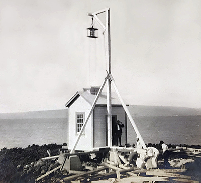 The first Kanahena Light, established around 1884, used two ordinary “kitchen lamps” displayed from a trestle tower 40’ high with a pyramidal room atop. In 1904, when the U.S. Lighthouse Establishment took over, the intensity of the light was upgraded to a lens lantern which could be seen 10 miles out to sea and in 1905, the light was hoisted atop a 35’ mast, as is shown in this photo. (Lighthouse Digest archives.)