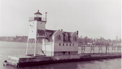 The first tower at Kewaunee Pierhead Front Range Lighthouse, as shown here, was removed from the pier in the early 1930s and was replaced by a tower constructed from the roof of the fog signal building. The catwalk to the lighthouse was still in place when this photo was taken. (U.S. Coast Guard Historian photo, Lighthouse Digest archives.) Back to the edition of: October 2010