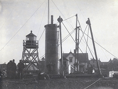 This close-up view shows the temporary Marblehead Lighthouse tower while the cylindrical center column of the new iron skeleton tower was under construction in 1895-1896. (Lighthouse Digest archives.) Back to the edition of: Jul/Aug 2019