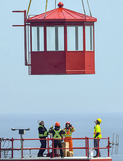 The Canadian Coast Guard crew waits patiently as the new lantern is slowly and carefully lowered for its final installation atop the Swallowtail Lighthouse. Back to the edition of: Nov/Dec 2019