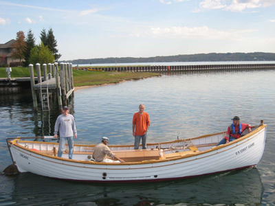 Historic and now restored rescue craft motoring out of the harbor into Grand Traverse West Bay in Greilickville, Michigan. Pictured left to right are, Jeff Shook at the tiller, Mark Pleune, George Powell and Bruce Lehman. Back to the edition of: December 2010