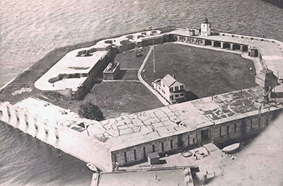 Historic aerial view of Fort Carroll and the Fort Carroll Lighthouse when everything was still in pretty good shape. This photo was taken before Benjamin Eisenberg installed replica cannons at the site. Today, the buildings are gone, the lighthouse is in ruin, and the island is overgrown. Back to the edition of: Jul/Aug 2020