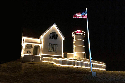 Nubble Light all lit up for Christmas. During the early years, the Town of York used regular Christmas bulbs to decorate the lighthouse. Now they use tube lighting. Back to the edition of: Jan/Feb 2021