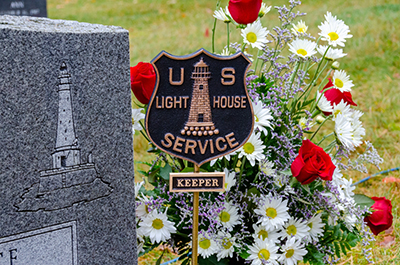 Close-up view of the U.S. Lighthouse Service Memorial Marker at George Keller’s gravestone. The gravestone has an engraving of White Shoal Lighthouse on it. (Photo courtesy Jill Ore)