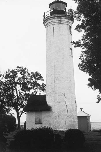 This July 1992 photo of Tibbetts Point Lighthouse clearly shows serious cracks in the base of the lighthouse. These cracks finally caused emergency repairs to the lighthouse in 1994. Back to the edition of: February 2000
