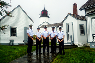 Even though it was raining heavily due to the remnants of Hurricane Fred passing by, the U.S. Coast Guard contingent braved the elements to take a photo in front of Burnt Island Lighthouse to mark its 200th bicentennial celebration. Pictured are (l-r) CDR Mark Neeland; CAPT Amy Florentino; MECM Dan Morales; BMCS Clay Franklin; and LT Shaun Doyle. Photo by Debra Baldwin Back to the edition of: Nov/Dec 2021