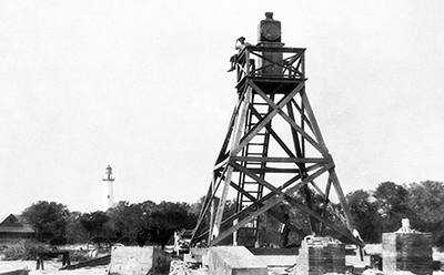 On October 17, 1896 a new St. Simons Front Beacon was completed and lighted to replace the one that had been destroyed the month before. The St. Simons Light, then referred to as the St. Simons Rear Range Lighthouse, can be seen in the distance. (Lighthouse Digest archives) Back to the edition of: Mar/Apr 2022