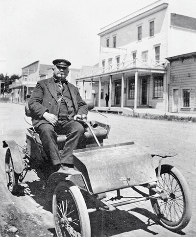 Wilhelm Baumgartner, who was the head keeper at California’s Point Cabrillo Lighthouse from 1909 to 1923, is shown here driving an early horseless carriage on the streets of Mendocino, California. Mr. Baumgartner was born on February 20, 1863, in the territory of Baden on the border of Germany and Switzerland. He immigrated to the United States in 1882. In 1902, he secured the position of 3rd assistant keeper at California’s dangerous St. George Reef Lighthouse and was promoted to 2nd assistant keeper in 1904, a position he held until 1905. He was then transferred and promoted to 1st assistant keeper at California’s Farallon Island Lighthouse. In 1907, he secured a transfer to the Point Conception Lighthouse, where he served until 1909 when he was promoted to head keeper at Point Cabrillo Lighthouse. (Photo, Lighthouse Digest archives, courtesy Point Cabrillo Lightkeepers Association, Baumgartner Family Collection)