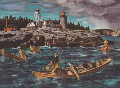 Named “Happy Lobstering,” this painting by Andrew Winter shows lobstermen in small dories hauling their traps in the waters off Maine’s Whitehead Island Lighthouse. The lighthouse is now owned by the Pine Island Camp, which oversees a variety of programs at the lighthouse. Back to the edition of: Sep/Oct 2022