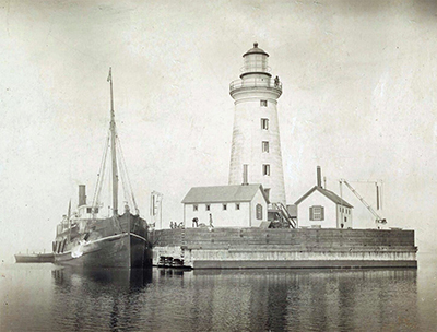 Undated photo of the Spectacle Reef Lighthouse with the Lighthouse Tender Aspen that had apparently brought supplies or a work crew to the lighthouse. The Lighthouse Tender Aspen saw service on the Great Lakes from 1906 to 1948. (Lighthouse Digest archives) Back to the edition of: Jul/Aug 2024