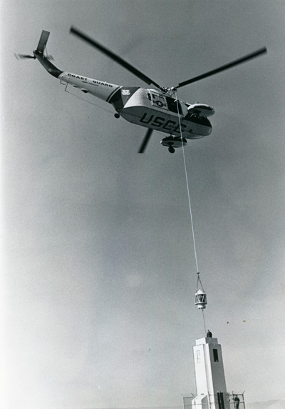 In February of 1970 the Coast Guard used a helicopter to remove and reinstall the 431 pound lens assembly over new quartz-iodide lamps atop the Browns Point light tower. According to the press release issued by the Coast Guard at that time, “The new lamps have a life span of 165 days, compared with the 33 days for the lamps previously used. Although intensity of the new blubs is nearly the same as the older ones, it remains constant throughout the life of the bulb. The older bulbs dimmed with age.” (Lighthouse Digest archives photo.)