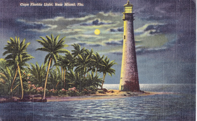 Vintage linen-style post cards of a moonlit night at Cape Florida Lighthouse were extremely popular in the 1930s and 1940s and were still being offered for sale as late at the mid-1950s. (Lighthouse Digest archives.) Back to the edition of: May/Jun 2013
