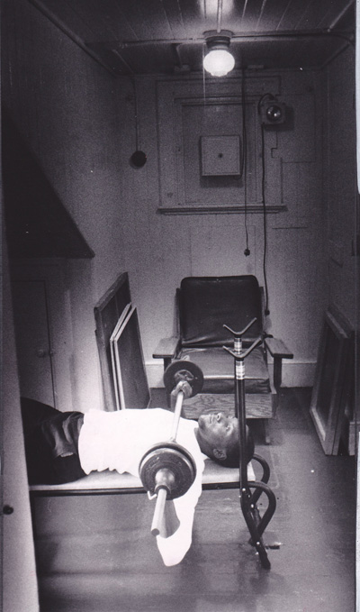 Willie Ziegler, one of the three man crew assigned in 1981 to the Thomas Point Shoal Lighthouse passed much of his time by lifting weights at the lighthouse. His stay would be for 16 days, before he got time off to leave the lighthouse and then repeat it all over again. Photo taken July 20, 1981. (Lighthouse Digest archives.) Back to the edition of: May/Jun 2013