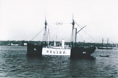 In 1897 the Relief Lightship LV 58 was painted red with a white field and black letters in the center of the white field. Although the year that this photo was taken is unknown, it was taken in New Bedford, Massachusetts. (Lighthouse Digest archives.) Back to the edition of: Jul/Aug 2013