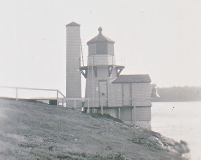 This nice image of Squirrel Point Lighthouse was taken in the 1940s by Shirley Morong when her husband, Clifton S. Morong, was stationed there for a short time as a relief keeper of the light. The tall tower on the left contained the weights which powered the fog bell. The weights had to be wound manually, and one full winding of the weights afforded about three hours of bell ringing. The tower for the weights was demolished sometime after the fog bell became powered by electricity for a bell striker that was inside the building. The tongue clapper was then only used if the power went out and would require the keeper to stand there and ring the bell manually during the entire time that fog was present. When fog horns were installed at the lighthouse, the bell remained in place as an emergency back-up. However, in later years the bell was removed. (Shirley Morong collection, Lighthouse Digest archives.)