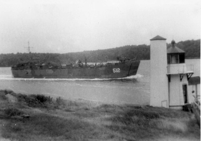 When Navy ships would pass Squirrel Point Lighthouse the Seavey children would ring the fog bell and the ships would always reply with a blast from their own horn. Shown here is a tank landing vessel that had been built in Seneca, Illinois by Chicago Bridge and Iron Co. that was used to make amphibious assaults and was involved with landing troops and equipment during D-Day at Normandy. After D-Day, the 328-foot LST 512 was damaged in a storm and returned to the United States for repairs, probably at Bath Iron Works when lighthouse keeper Harold Seavey captured this photo as it went past Maine’s Squirrel Point Lighthouse. She was later named the USS Burnett County and was eventually retired from service and sold in 1957 to the Peruvian Navy. (Photo courtesy of Ellen Teschler and Patricia Seavey Howard.)