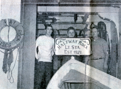 Three of the four Coast Guard keepers at Halfway Rock in December, 1953 (l-r) Seaman Bradford S. Nelson, Seaman Ivan Lavigne, and Boatswain Forest Cheney stand in the doorway of the boat house with the station sign. The sign was usually kept inside and broken out only when company would arrive. If mounted outside, it would often blow away; or if it was attached, some weekend boater would pile up on the rocks trying to get close enough to the island to read the sign. Back to the edition of: Jul/Aug 2014