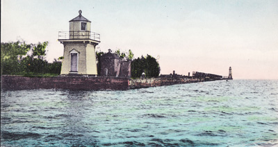 Rare vintage post card image of the Sodus Point Inner Range and Outer Range lights. The Inner Range Light was on land and the Outer Range Light was at the end of the pier. In 1938, rather than repair or restore the wooden Sodus Inner Range Lighthouse, it was demolished and replaced by a light on a steel pole. (Lighthouse Digest archives photo.) Back to the edition of: Jul/Aug 2014