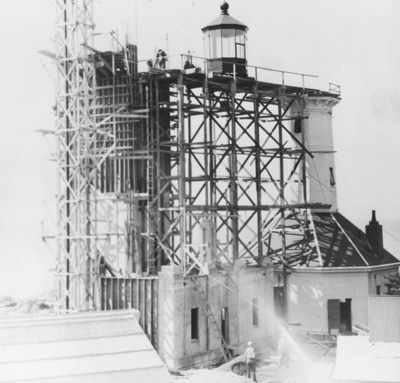 This image taken in 1934 shows when the workmen were removing the lantern room from the original 1903 wooden Tree Point Lighthouse tower and moving it along the top of the scaffolding to be installed atop the new tower. (Lighthouse Digest archives.) Back to the edition of: Sep/Oct 2014