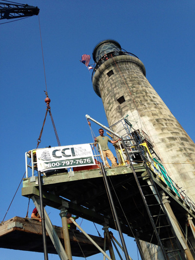 Looking up at the dock, with the banner of one of the contractors, CCI Construction, which is doing all the masonry restoration at Graves Lighthouse. Back to the edition of: Sep/Oct 2014