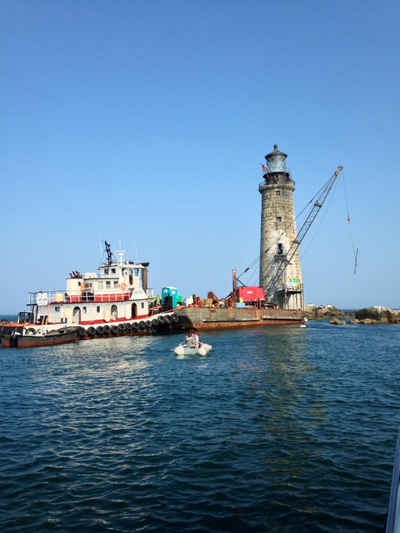 Tugboat, barge and crane at Graves Light. The crane is to support the stonemasons who are repairing cracked stone, removing old grout, and re-pointing all the masonry; and to repair the rotted sections of the dock. Back to the edition of: Sep/Oct 2014
