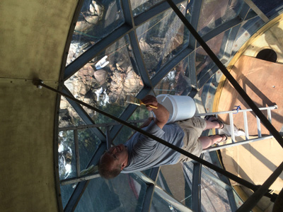This image of Mike Sylvester in lamp room is taken from 110 feet up, on the inside, as he primes and paints the original iron tie rods that hold the roof of the lighthouse together. The crew had just sandblasted all the metal inside the lighthouse, covered the bronze with clear coat, primed the iron in green, and were then painting the iron with a white epoxy paint before applying a final top coat. The paint job should last another 100 years.