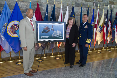 Shown here at the unveiling of the new U.S. Coast Guard postage stamp are (l-r) Secretary of Homeland Security Jeh Johnson, Postmaster General Megan Brennan, and Commandant of the United States Coast Guard, Admiral Paul Zukunft. Back to the edition of: Sep/Oct 2015
