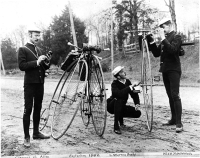 Max Hannsmann is shown here on the far right, with two other cyclists. Can you imagine riding one of these types of cycles, called a “penny-farthing,” or high-wheel bike, for any great distance as Max Hansmann often did? On one of those trips, Max Hansmann and fellow bicycle club members rode these bikes all the way from Washington, D.C. to Boston and back over roads that would be called cart tracks today. (Photograph courtesy. Martin Luther King Memorial Library, Washington, D.C.)