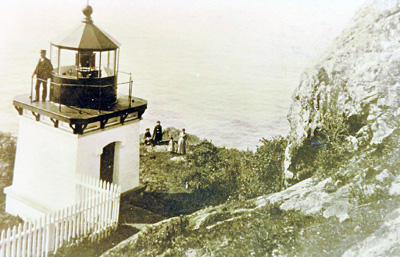 This vintage view of the 1871 Trinidad Lighthouse shows a lighthouse keeper standing on the outer walkway and some people standing by the edge of the cliff who might have been family members of the lighthouse keeper. (Lighthouse Digest archives.) Back to the edition of: Jan/Feb 2016