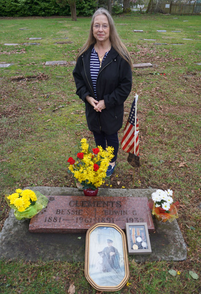 Shown is Georgene Finch with the new USLHS tombstone marker at the grave of lighthouse keeper Edwin Clements. Also shown is a framed photo of keeper Clements, some of his World War I medals, and the small United States flag that belonged to Clements that was originally placed on his coffin at his funeral in January of 1940. Back to the edition of: May/Jun 2016
