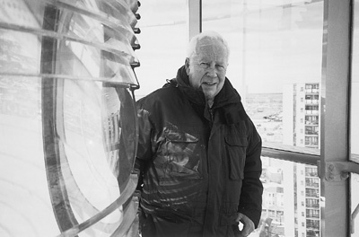 A keeper’s work is never done! On a cold, snow covered New Year’s Day 2001, Rich Veit climbed the Absecon Lighthouse to check the environmental conditions in the tower. Here he is checking the lantern room and the magnificent 1st order Fresnel lens. Back to the edition of: February 2001