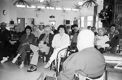 From his wheelchair Bob Bolen talks about lighthouses to an attentive audience. Back to the edition of: April 2001