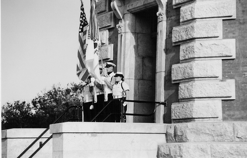 The U.S. Coast Guard Honor Guard opens the ceremony as they descend down the stairs of the Cape Hatteras Lighthouse toward the front of the podium. Back to the edition of: June 2001