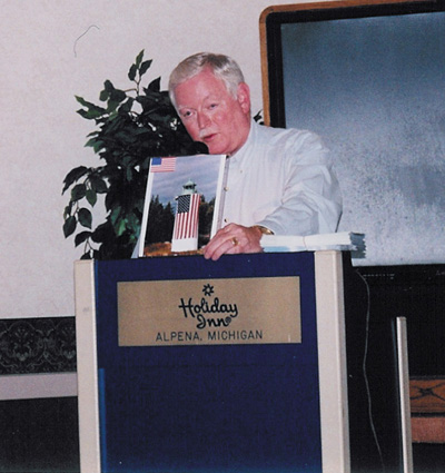 Tim Harrison, showing a photograph of the flag draped Little River Lighthouse explained the relighting program of the Maine lighthouse to the audience at the Saturday night Keepers Dinner at the Great Lakes Lighthouse Festival. Back to the edition of: November 2001