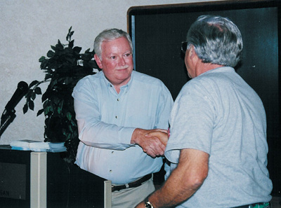 Tim Harrison, president of the American Lighthouse Foundation presenting Marv Theut, cofounder of the Great Lakes Lighthouse Festival with a check for $5000 for its partnership sharing program that financially assists ten different Great Lakes Lighthouses. Back to the edition of: November 2001