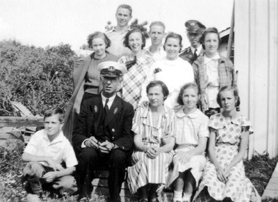 The Gustavus family gathered for a Christmas card photo at Dumpling Rock in 1935. Front, left to right: Son Edward (lost in the 1938 hurricane), Keeper George T. Gustavus, wife Mabel Norwood Gustavus, daughters Martha and Florence. Rear, left to right: daughter Mabel, son Roy, daughter Helen, son Frank, daughter Lillian, son George (in Army uniform) and daughter Marian. Courtesy of Joan Kenworthy.