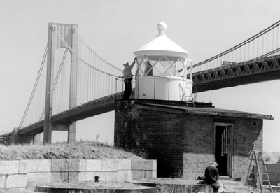 Volunteers work on the lantern of Fort Wadsworth Lighthouse with the Verrazano Bridge in the background. Back to the edition of: July 2003