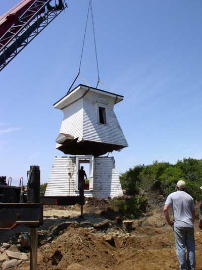 The upper half of the tower is lowered into position. Photo courtesy of Le Village Historique Acadien de la Nouvelle Ecosse Back to the edition of: October 2004